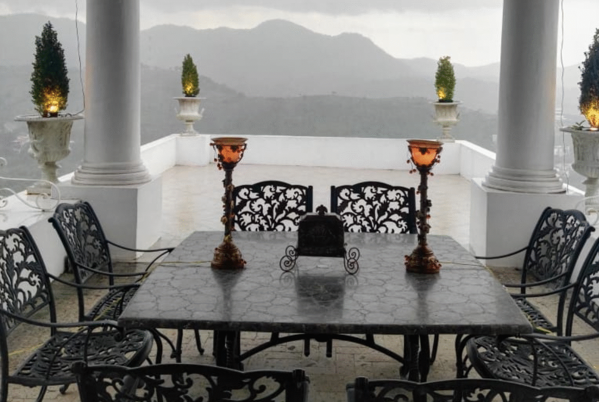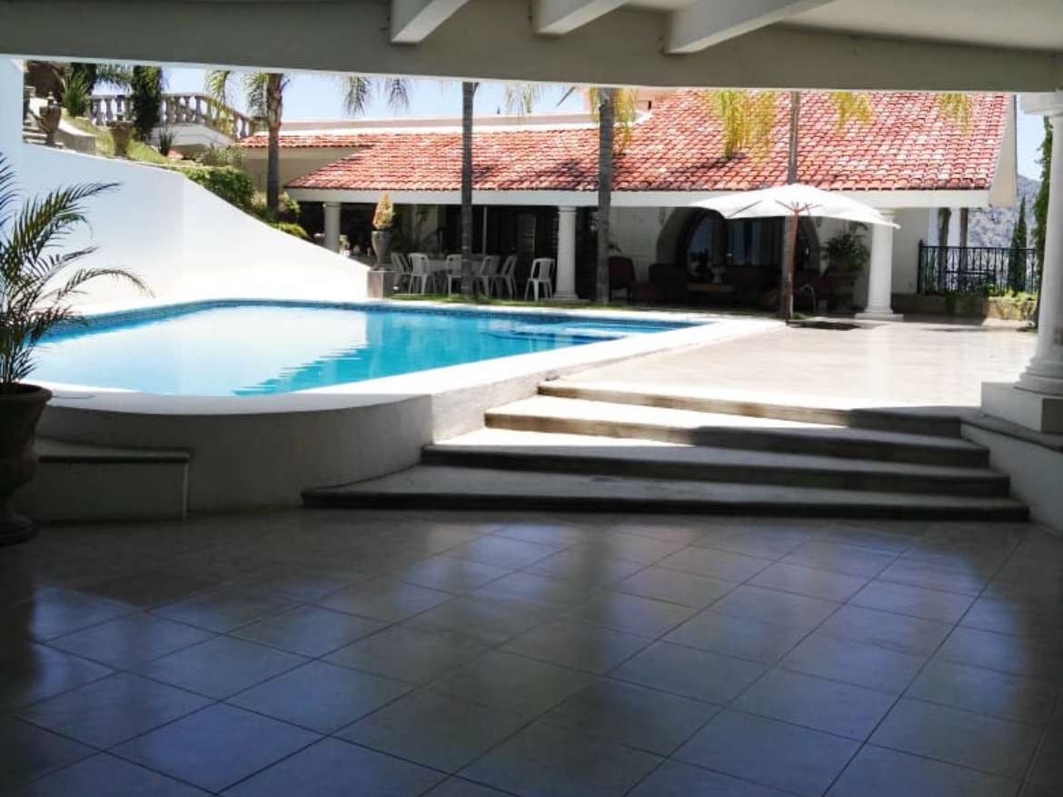 Terraza con vista hacia la alberca y la parte trasera de la propiedad